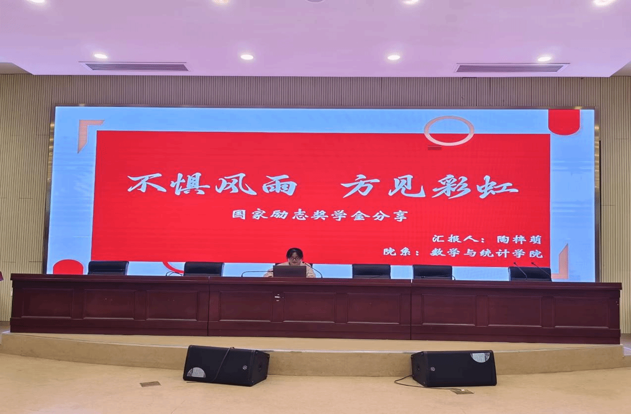 国家励志奖学金获得者、2023级应用统计学专业 陶梓萌同学以“不惧风雨,方见彩虹”为主题,讲述了自己考入大学后如何克服经济压力与学业挑战的故事。她提到,学院提供的各种助学政策为她解决了后顾之忧,而每日坚持6小时高效学习的习惯让她逐步实现专业排名的飞跃。“困难不是终点,而是蜕变的起点。”她坚定的话语赢得全场掌声。