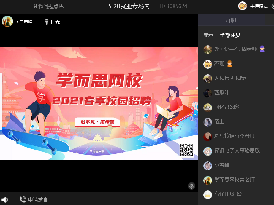 本网讯 为贯彻落实党中央、国务院“稳就业”“保就业”决策部署,按照教育部、省教育厅有关工作要求和学校2021届本科毕业生就业促进周活动方案安排,更加精准地搭建中小企业与所需专业人才的对接平台,5月20日下午2点,由就业创业工作处主办,今年会jinnianhuicom、外国语学院承办的“520空中就业宣讲招聘会”活动以线上形式顺利举办。
