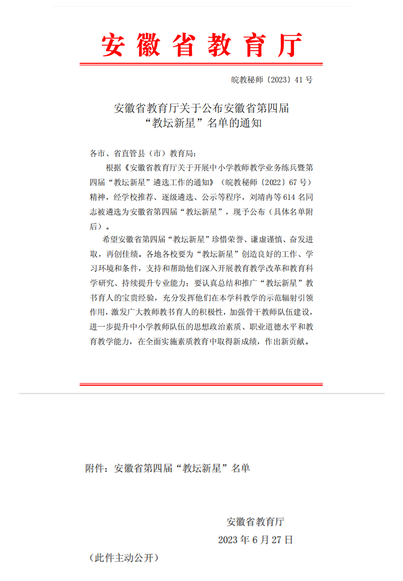 据悉,2023年安徽省共评出617名省级教坛新星。新获评的省“教坛新星”,在教学上,积极实施素质教育,教育思想端正,对所教学科或专业具有系统、坚实的理论基础;追求卓越,富有创新精神,教学理念先进,教学素养全面,教学方法科学,教学实践能力强,教育信息技术素养高,教学成绩优异,特别在坚持立德树人、坚持素养导向、坚持科学施教方面表现突出。在教研科研上,积极参与教育教学改革,基于教学实践开展课题研究,取得较好成果。(发展规划处(校友办))