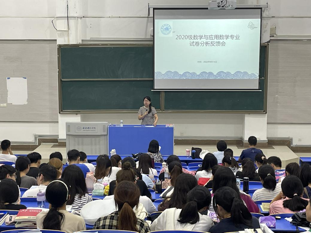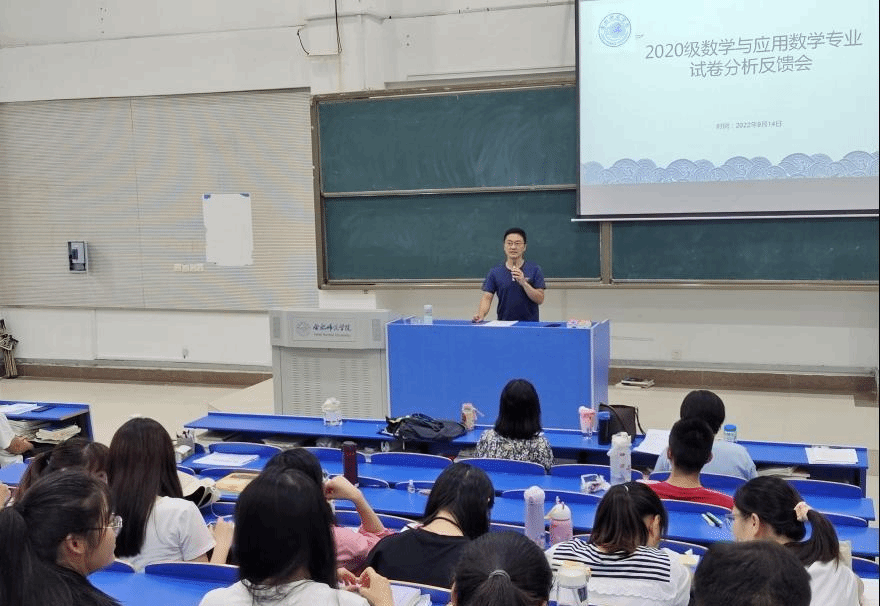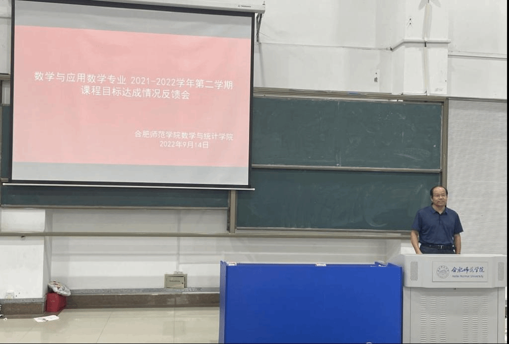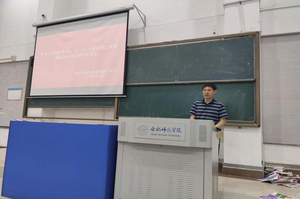 本网讯 为进一步落实师范专业认证标准,完善课程教学质量评价机制,保证“学生中心,产出导向,持续改进”专业认证理念落到实处,9月14日下午,今年会jinnianhuicom在逸夫楼A106、西阶1、西阶2同时召开2021-2022学年第二学期数学与应用数学专业课程目标达成情况反馈会。数学与应用数学专业负责人王家正教授、数学系系主任许和乾老师、数学与应用数学专业2021-2022学年第二学期全体任课教师、学院质量小组成员以及2019级、2020级和2021级数学与应用数学专业的全体学生参加会议。