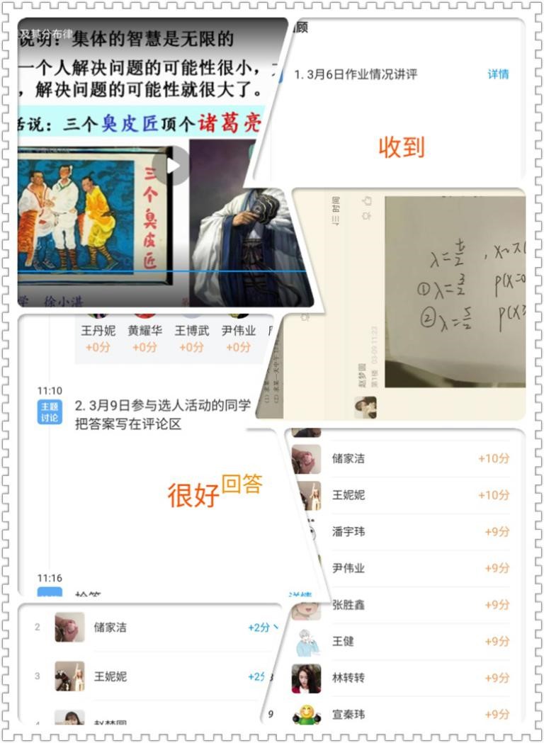 教学视频学习结束后是一系列集中互动环节,我将学习重点按不同难度要求,通过选人、抢答、问卷和讨论题的方式让学生回答,达到巩固的效果。简单的定义和定理,选人回答;稍有难度的问题,抢答进行;同时还设置了拓展题目,通过讨论的形式,让大家各抒己见。最后我再发布讲解视频,一目了然。此外,巧妙设置加分项,充分调动了学习积极性。