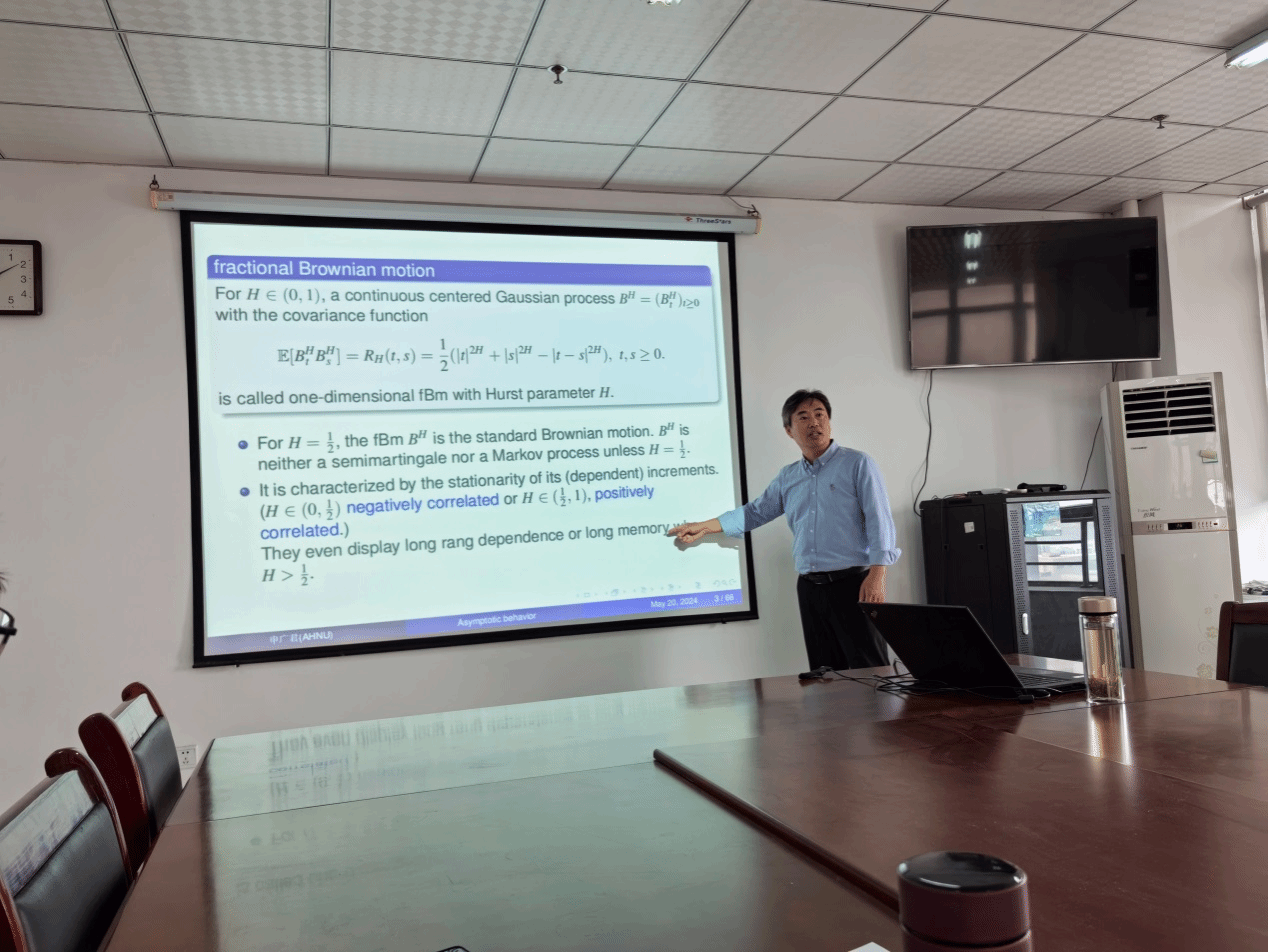 5月20日,应今年会jinnianhuicom邀请,安徽师范大学今年会jinnianhuicom申广君教授在行知楼1102会议室作了题为“Large and moderate deviation principles for multi-scale DDSDEs driven by fractional Brownian motions”的学术报告,今年会jinnianhuicom院长杨刘,副院长黄浩以及学院部分教师参加了报告会。报告会由杨刘主持。