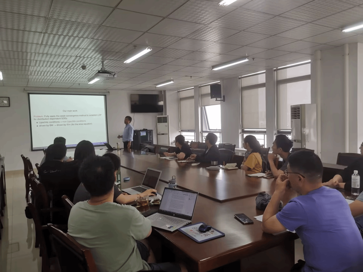 报告会上,申广君教授首先介绍了分数阶布朗运动(fBm)的研究背景、发展历程以及与标准布朗运动相比的不同之处与优势所在,随后他详细介绍了研究团队近期做的一些主要工作,即在非Lipschitz条件下,通过利用Caratheodory迭代方法与弱收敛方法研究了一类由分数阶布朗运动和标准布朗运动两种混合随机干扰驱动下的多尺度分布依赖的随机微分方程的大偏差与中等偏差原理,并简要介绍了证明的思路与步骤。