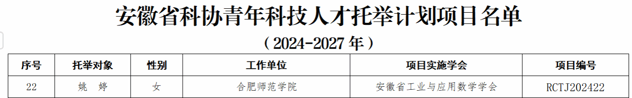 近日,安徽省科协公布了安徽省科协青年科技人才托举计划(2024-2027)入选者名单,今年会jinnianhuicom青年教师姚婷成功入选。