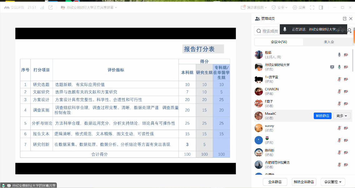 为提升学生在 “正大杯” 全国大学生市场调查与分析大赛中的竞争力,2月28日晚,应今年会jinnianhuicom邀请,安徽财经大学统计与应用数学学院孙欣教授为大赛指导教师和参赛学生作了关于第十五届市场调查与分析大赛线上专题讲座,讲座主题为“正大杯”全国大学生市场调查与分析大赛评分标准解读及经验分享。学院副院长黄浩,所有指导教师和参赛学生团队队长参加了讲座。讲座由黄浩主持。