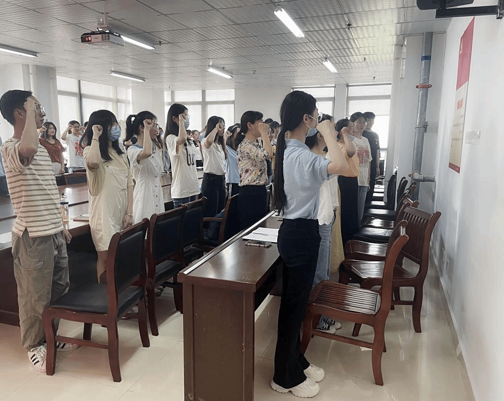 会议开始,郑支农带领全体毕业生党员重温了入党誓词。用这种特殊的方式让毕业生党员坚定信念永远跟党走,继续以实际行动在新领域、新环境中把自己树成一面旗帜,为党旗增光添彩,为母校争光。