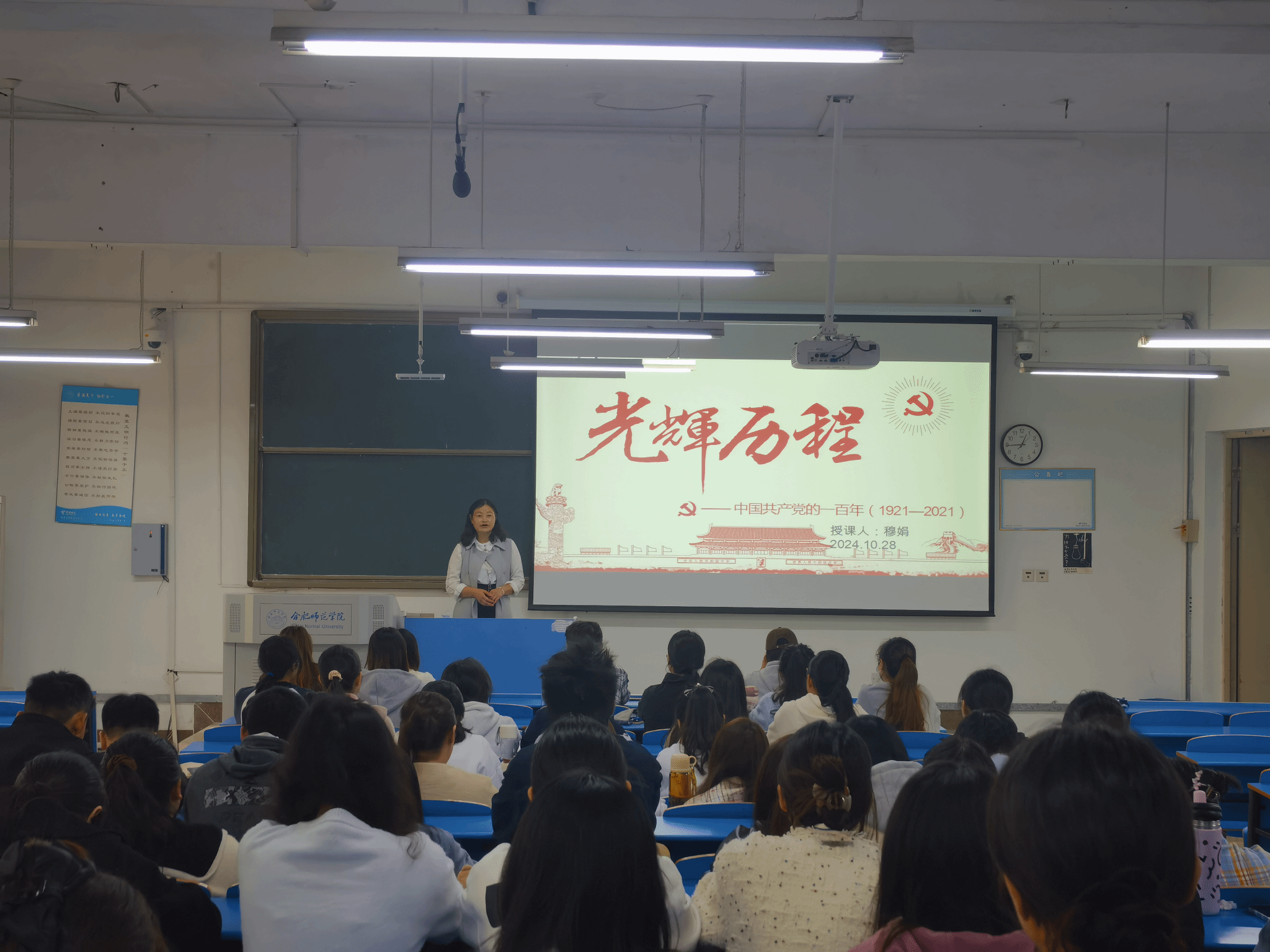 开班仪式后,穆娟以《党的光辉历程》为题作了首次授课,她从学习党史的重要意义入手,回顾了中国共产党创立的历史背景、党的成长所经历的重大历史变革等内容,从新民主主义革命时期、社会主义革命和建设时期、改革开放和社会主义现代化建设新时期以及中国特色社会主义进入新时代四个阶段,系统详尽、深入浅出地讲述了党的光辉历程,教育引导青年大学生要铭记党的光辉历程,学习好党史,继承传承好党的成功经验和优良传统,在学习领悟中坚定理想信念,在奋发有为中践行初心使命,更好地肩负起新时代所赋予的使命任务。(今年会jinnianhuicom:王志 叶宇鹏)
