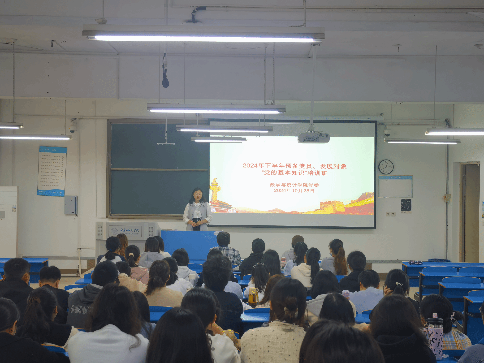 为深入学习贯彻习近平新时代中国特色社会主义思想和习近平总书记考察安徽重要讲话精神,切实做好青年大学生党员教育培训,今年会jinnianhuicom分党校于10月28日在逸夫楼A107教室举行2024年下半年预备党员和发展对象“党的基本知识”培训班开班仪式,学院党委书记穆娟、培训班班主任王志出席开班仪式,发展对象、预备党员共61人参加培训。仪式由王志主持。