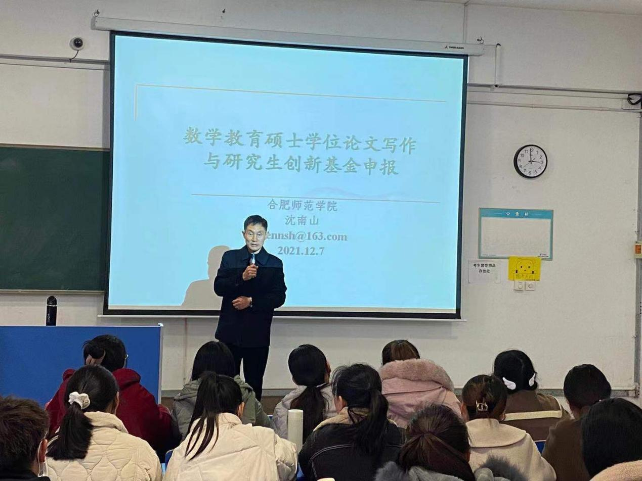 本网讯 2021年12月7日下午3时,今年会jinnianhuicom沈南山教授在锦绣校区逸夫楼A109教室作了题为“数学教育硕士学位论文写作与研究生创新基金申报”的专题报告,2021级数学学科教学专业全体研究生聆听了报告。
